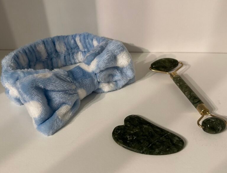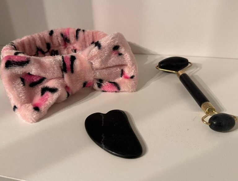 Coffret Beauté 3 Pièces – Bandeau Spa + Rouleau de Jade + Pierre Gua Sha (Blanc et Rose)
