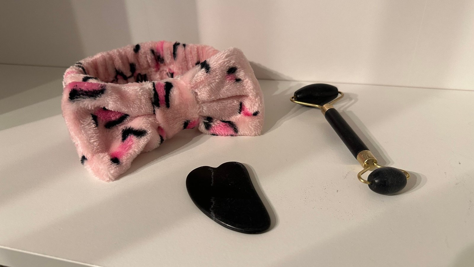 Coffret Beauté 3 Pièces – Bandeau Spa + Rouleau de Jade + Pierre Gua Sha (Noir et Rose)